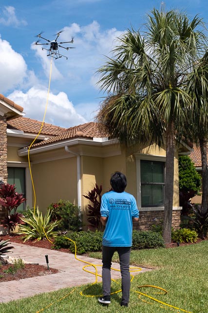 No more walking on the roof! Using the drone, we spray Roof-A-Cide while still standing on the ground. The treatment is guaranteed to keep your roof clean for 2 years and to prevent fungus, mold, and mildew from appearing on the surface.